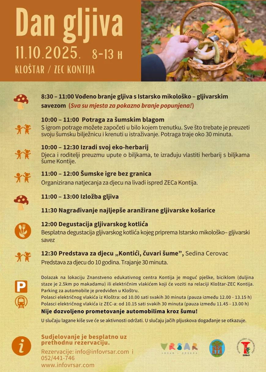 8:30 – 11:00 Vođeno branje gljiva s Istarsko mikološko – gljivarskim savezom: Dan započinje pokaznim branje gljiva, kojeg predvode iskusni članovi Istarskog mikološko-gljivarskog saveza. Uz stručne savjete, sudionici će naučiti prepoznavati jestive i nejestive vrste gljiva, što je savršena prilika za sve entuzijaste i one koji žele produbiti svoje znanje o gljivama. Mjesta za pokazno branje gljiva su sva popunjena.