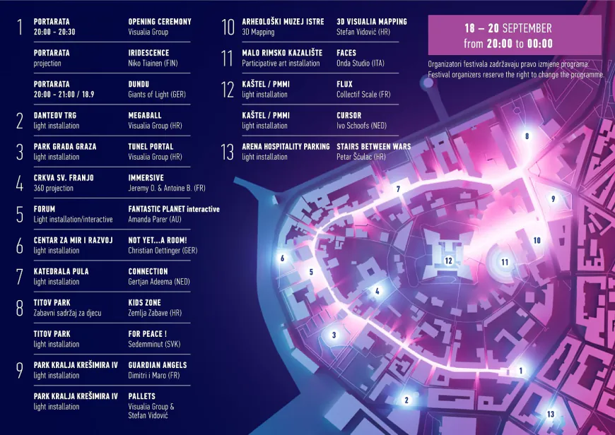 Festival će se održati na 13 lokacija diljem grada sa 17 svjetlosnih instalacija. Ulaz je slobodan.