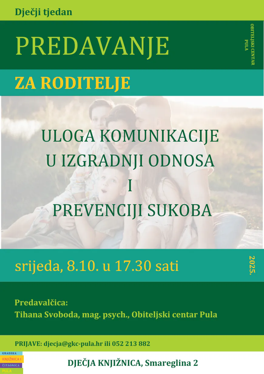 U sklopu Dječjeg tjedna, čija je ovogodišnja tema empatija, Gradska knjižnica i čitaonica Pula u suradnji s Obiteljskim centrom, Područnom službom Istarskom organizira predavanje Uloga komunikacije u izgradnji odnosa i prevenciji sukoba, koje će roditeljima pomoći da bolje razumiju svoje dijete i izgrade snažniji, otvoreniji odnos.